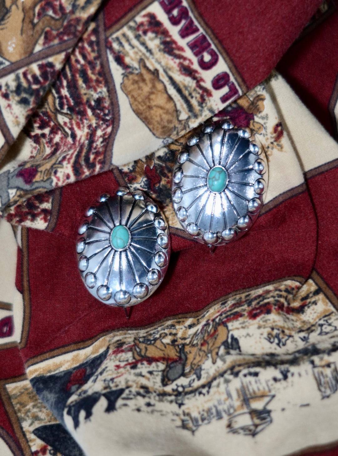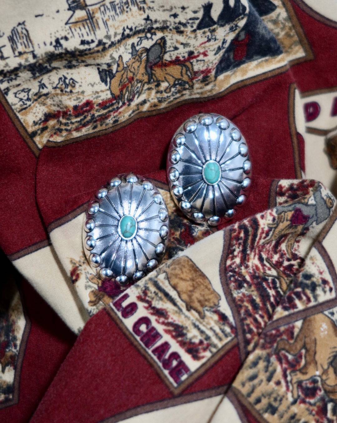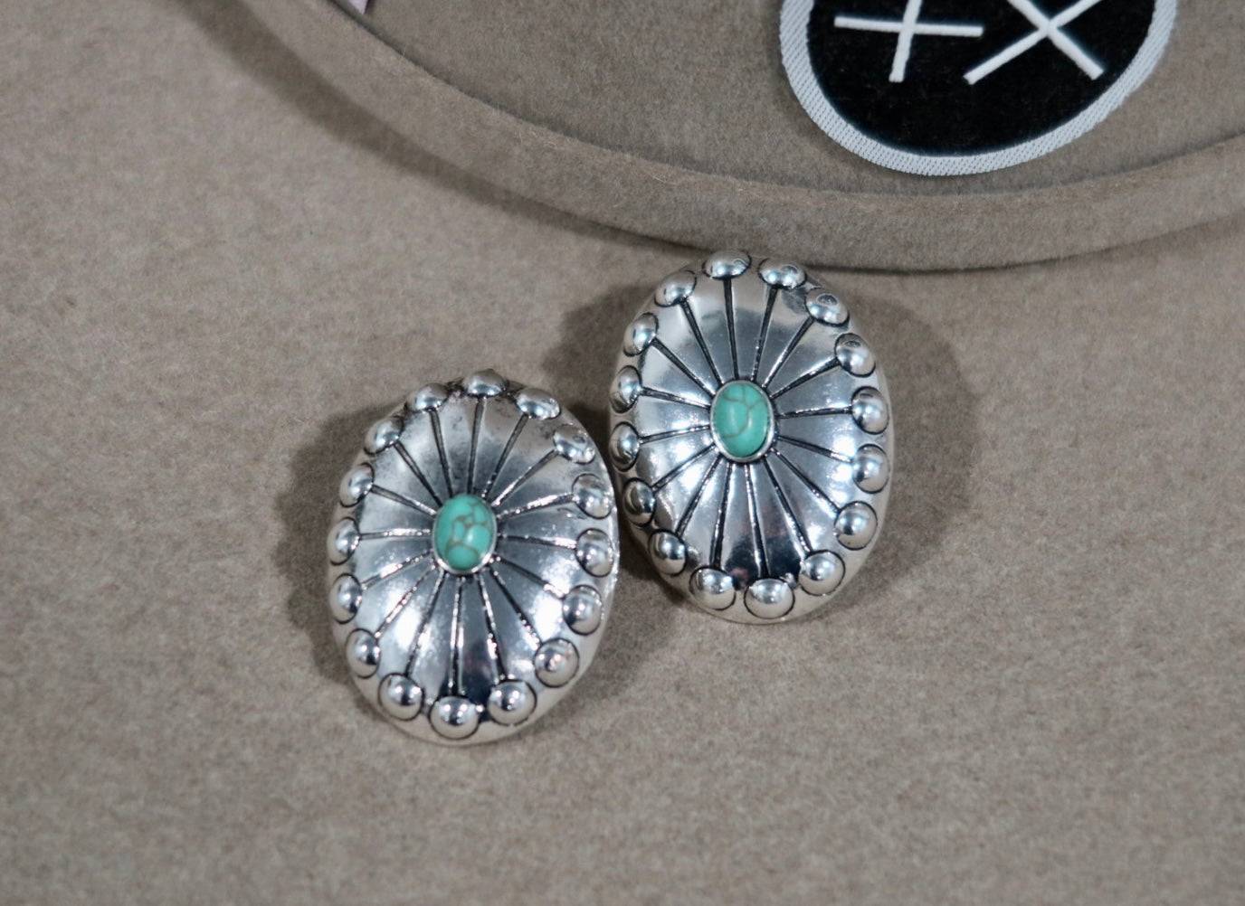 Get ready to make a statement with our Rowdy Concho Post Earring! This burnished silver earring features a studded concho design and a pop of turquoise for a bold, Southwest-inspired touch. Step up your fashion game and add some attitude to any outfit (or ear!) with these lively earrings.