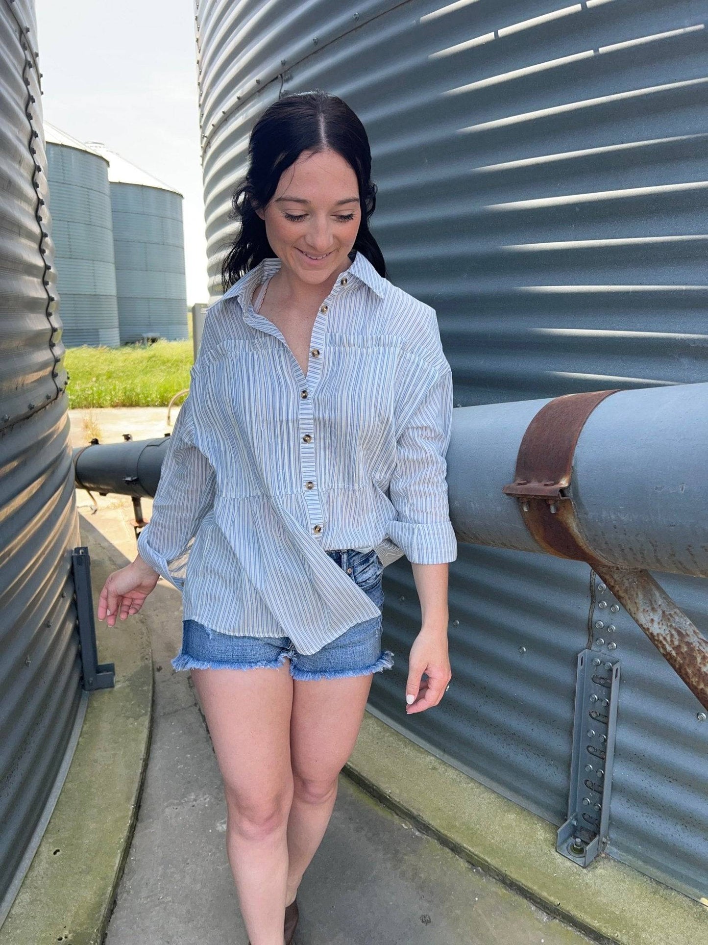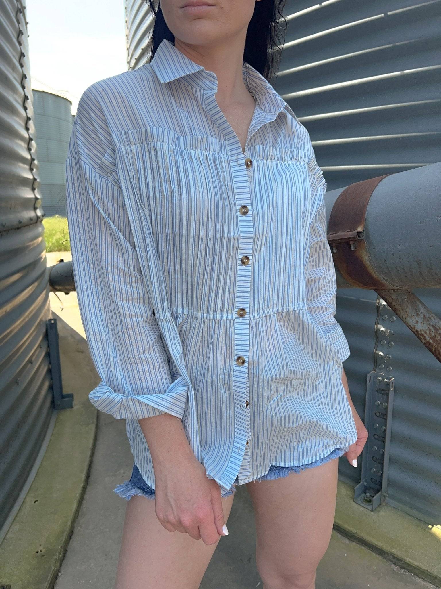 Introducing The Dutton, the perfect combination of sophistication and femininity. This pinstripe button down features a flattering ruffle accent and comfortable long sleeves. Elevate your style with this must-have addition to your wardrobe.