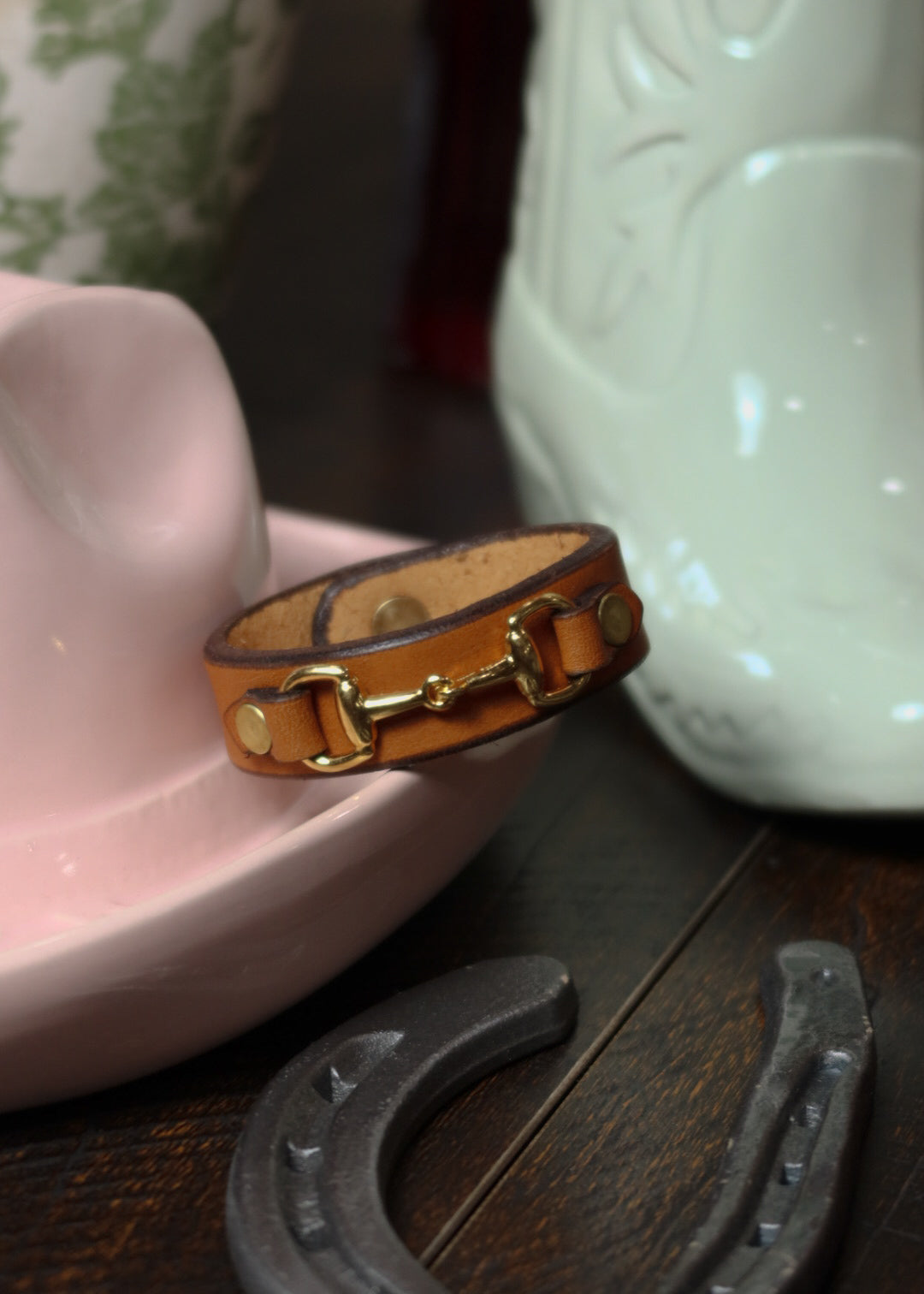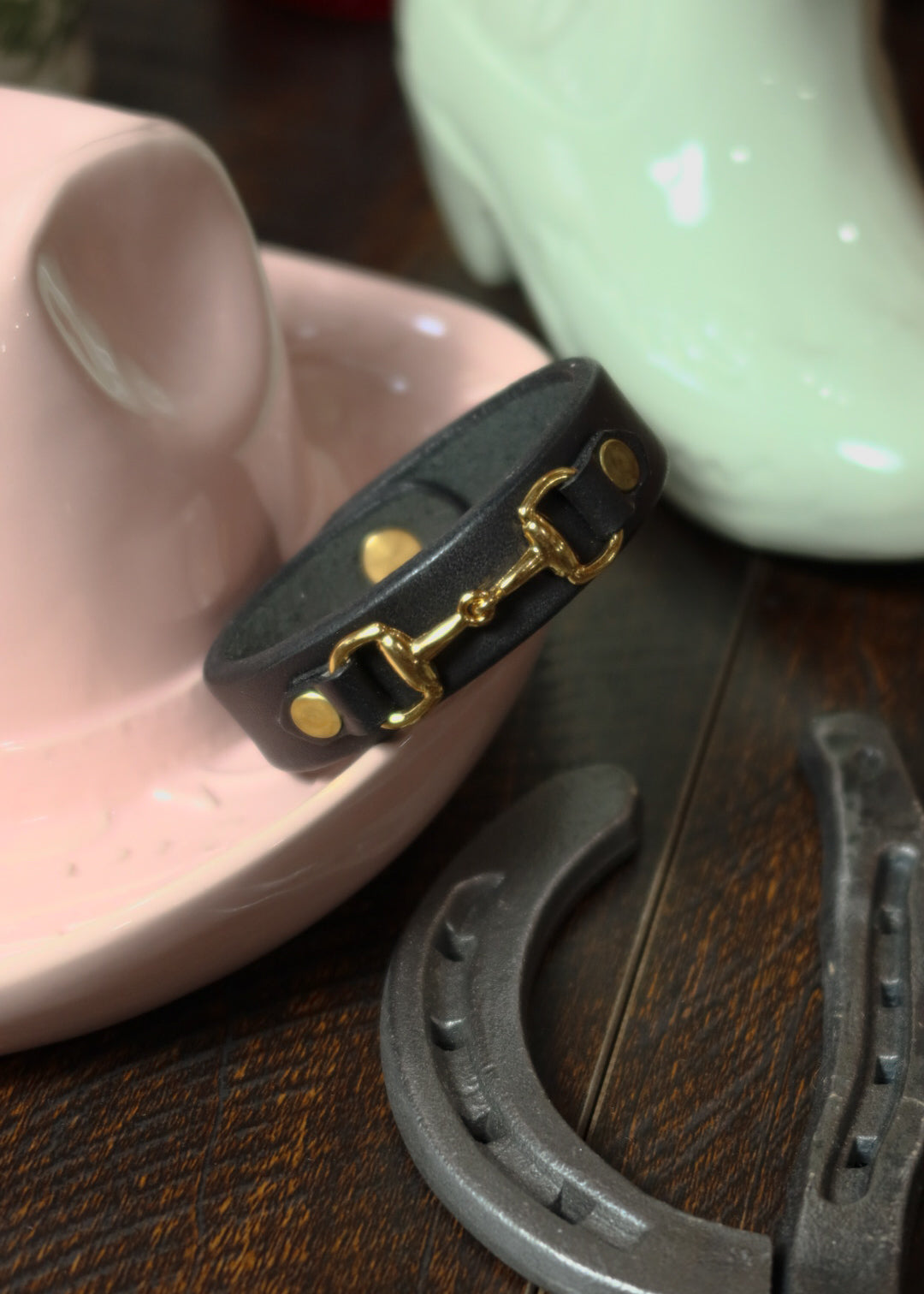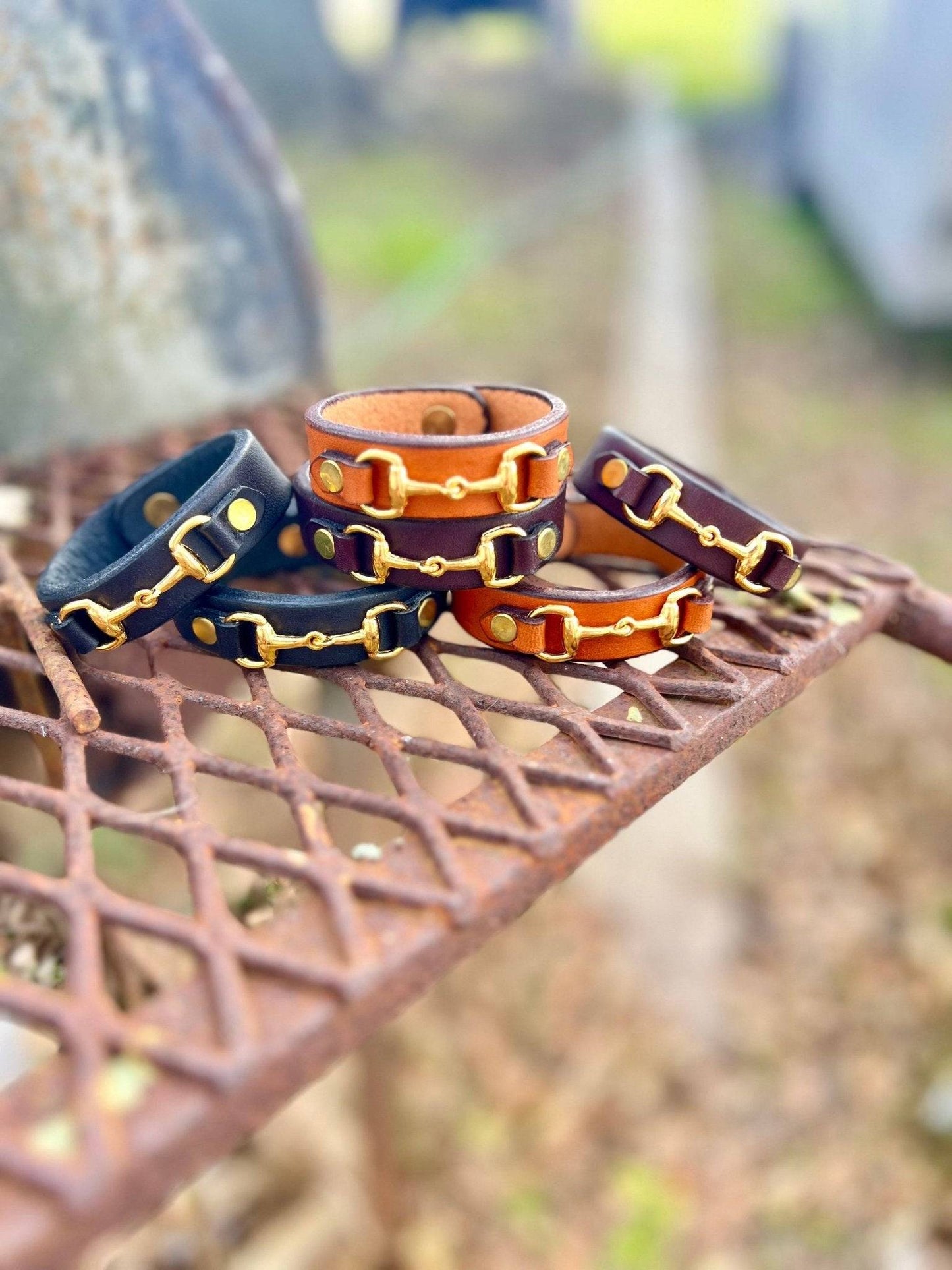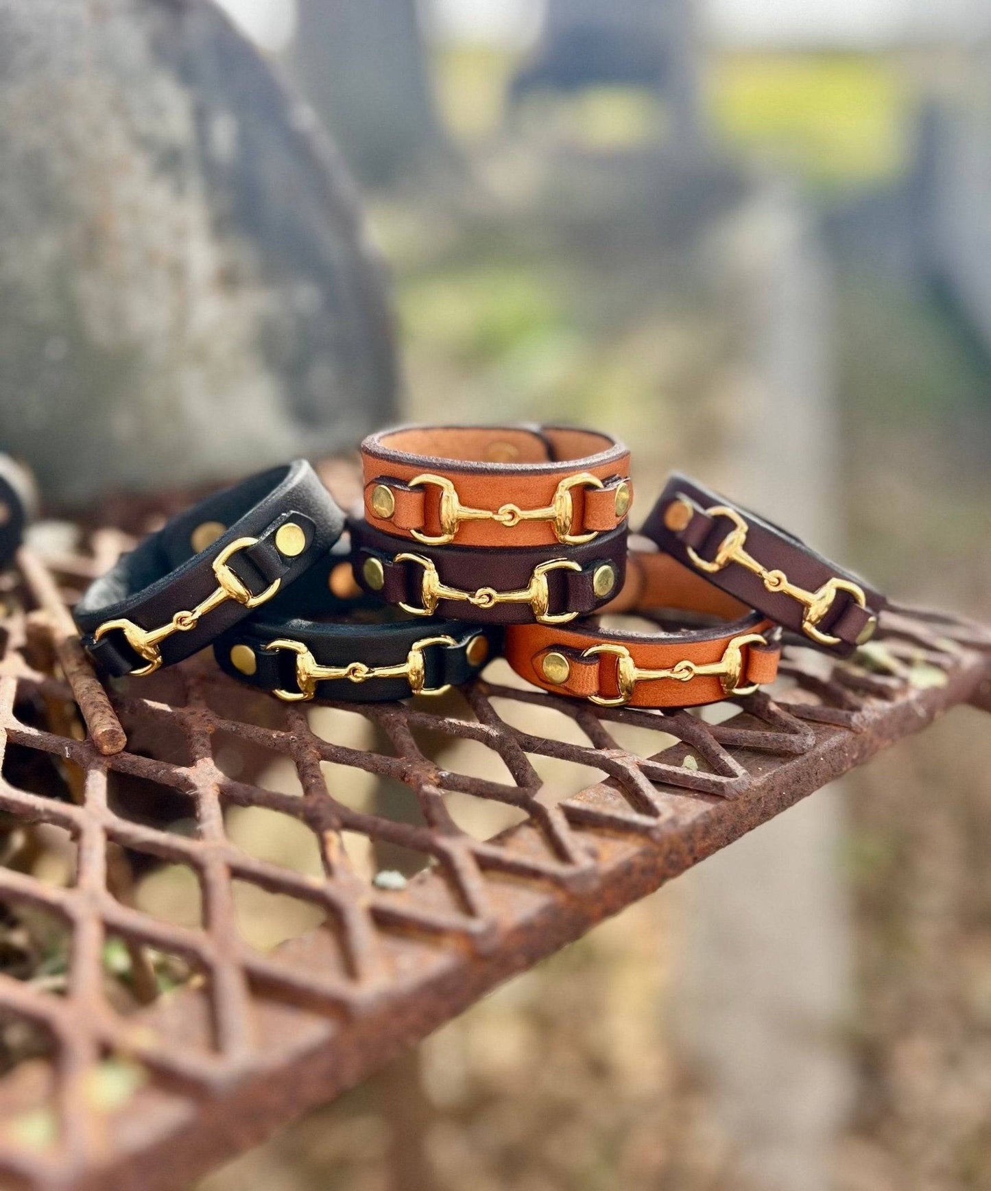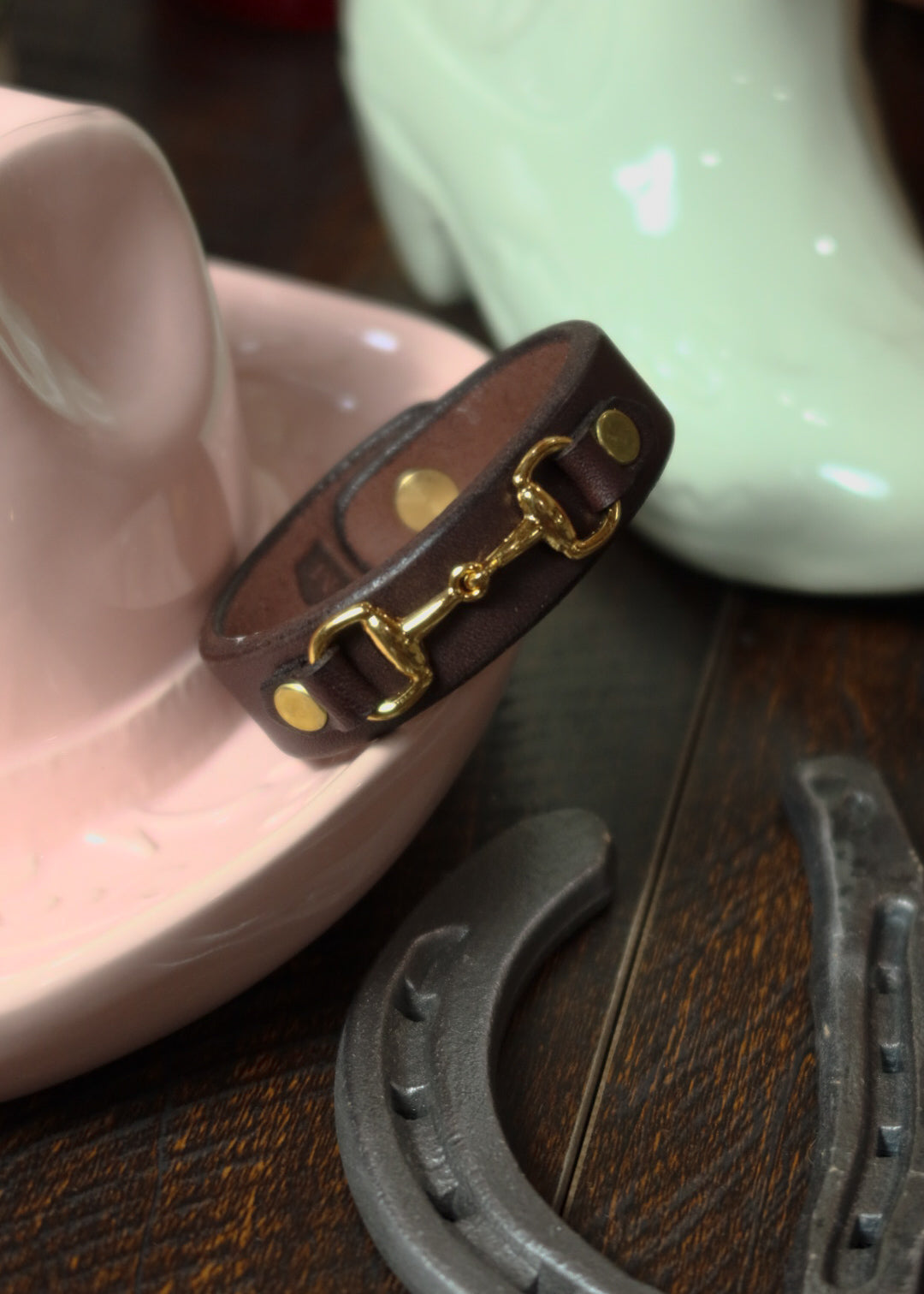 The Leather Bit Bracelet is the perfect combination of craftsmanship and style. Handcrafted with English bridle leather and accented with brass rivets, this bracelet will add a touch of elegance to any outfit. The single brass plated mini horse bit adds a unique and sophisticated detail. Available in two sizes for a perfect fit.