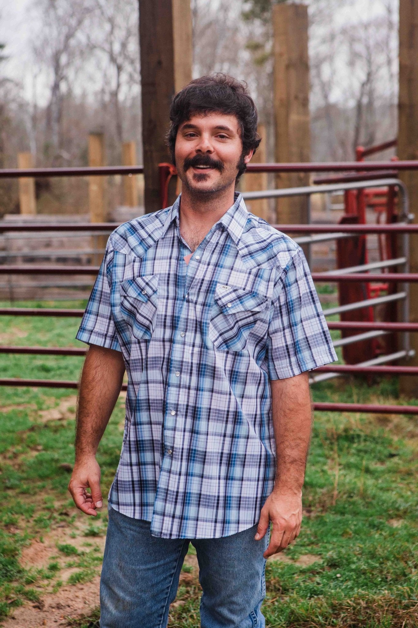 Elevate your style with The Welder Pearl Snap! Crafted from easy care fabric, this short sleeve shirt features a textured blue plaid design, pearl snap closures, and convenient front pockets. With its collared neckline, it's perfect for any occasion. Make a statement and look effortlessly cool in this must-have piece.